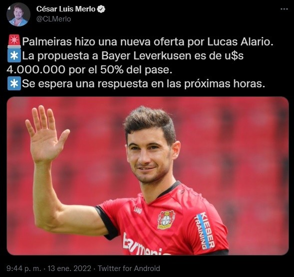 El periodista César Merlo contó los detalles de la negociación: “Palmeiras hizo una nueva oferta por Lucas Alario. La propuesta a Bayer Leverkusen es de U$S 4.000.000 por el 50% del pase.️ Se espera una respuesta en las próximas horas”. ¿Pasará a ser rival del Millonario?