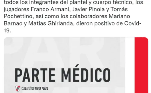 “Tras los hisopados realizados a todos los integrantes del plantel y cuerpo técnico, los jugadores Franco Armani, Javier Pinola y Tomás Pochettino, así como los colaboradores Mariano Barnao y Matías Ghirlanda, dieron positivo de Covid-19”, indica el parte médico que River difundió en sus redes.