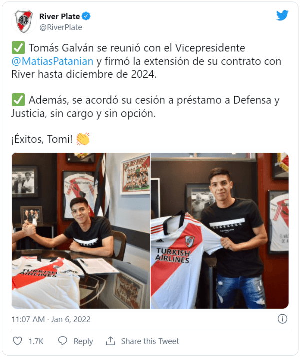 “Tomás Galván se reunió con el Vicepresidente Matias Patanian y firmó la extensión de su contrato con River hasta diciembre de 2024. Además, se acordó su cesión a préstamo a Defensa y Justicia, sin cargo y sin opción”, comunicó el club de Núñez sobre una de sus promesas más auspiciosas del 2021.