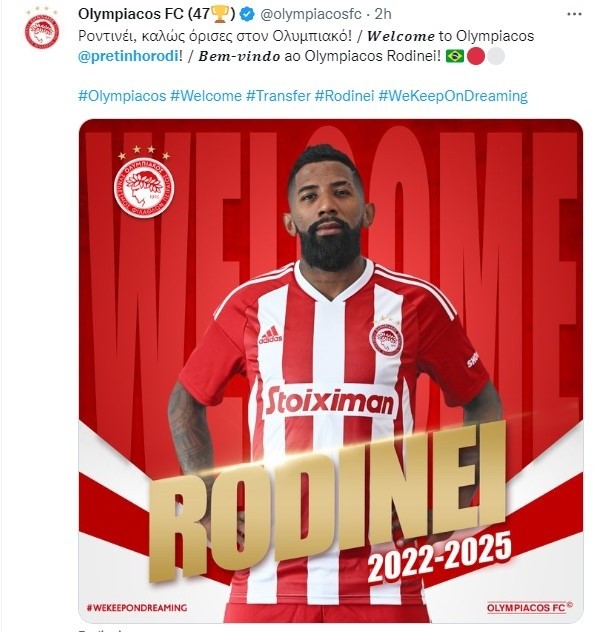 Pese al interés de River y varios equipos grandes de Brasil, el lateral decidió priorizar un salto a Europa y escuchó la oferta del Olympiacos antes de poner la firma. No fue hasta este domingo que Rodinei fue presentado oficialmente como refuerzo del conjunto griego, que aspira a quedarse con todos los títulos locales de la mano de figuras como James Rodríguez y Marcelo, entre otras más.