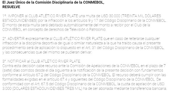A lo largo de las últimas horas, desde laConfederación Sudamericana de Fútbol dieron a conocer la sanción que percibió el individuo:además de que River lo suspendió por un total de seis meses y no podrá utilizar ninguna de las instalaciones de la institución durante ese tiempo, deberá realizar un curso de concientización en el Instituto Nacional contra la Discriminación, la Xenofobia y el Racismo (INADI). Y como si fuera poco, el Millonario fue sancionado conuna multa deUSD 30.000 (TREINTA MIL DÓLARES ESTADOUNIDENSES) por la infracción a los artículos 9 y 17 del Código Disciplinario de la CONMEBOL. El monto de esta multa será debitado automáticamente del monto a recibir por el Club de la CONMEBOL en concepto de derechos de Televisión o Patrocinio.