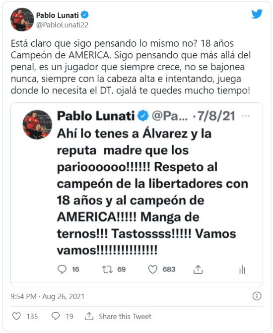 Los simpatizantes del Millonario destacaron a varios futbolistas por su desempeño en el encuentro, que tuvo a Enzo Pérez como gran figura. Pablo Lunati, por su parte, sacó pecho por uno al que siempre bancó y no tuvo miedo de expresarlo en su cuenta de Twitter.
