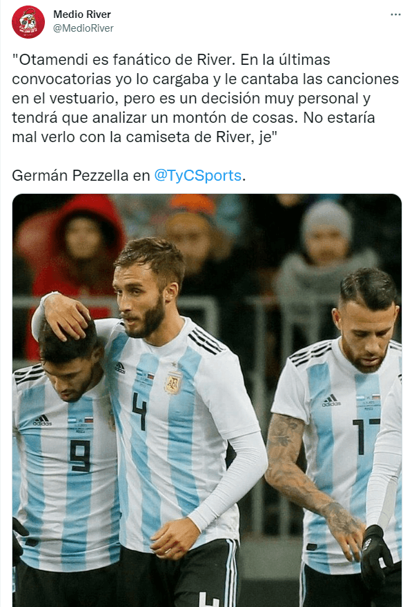 En ese contexto, un exjugador de River puso más “manijas” a los hinchas con sus recientes declaraciones en TyC Sports. Germán Pezzella fue consultado por la posible llegada de su compañero de selección al club de Núñez y el zaguero se permitió bromear.”Otamendi es fanático de River. En la últimas convocatorias yo lo cargaba y le cantaba las canciones en el vestuario”, contó.