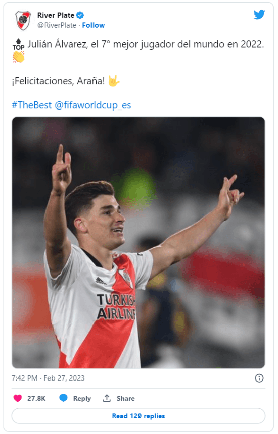 En la misma lista que encabezó Messi, apareció el delantero del Manchester City. La Araña juntó muchísimos votos (17 exactamente) y quedó en el puesto 7. “Julián Álvarez, el 7° mejor jugador del mundo en 2022”, escribió River en su cuenta de Twitter. ¡Bien, Araña!