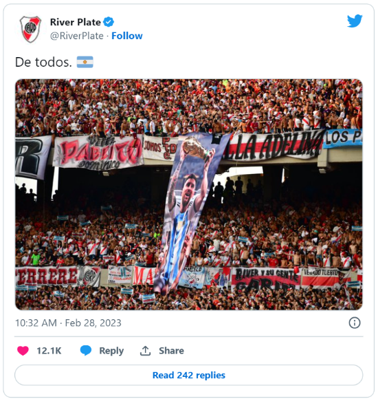 El Millonario aprovechó para subir una imagen de su gente con la bandera de Lionel Messi, gran ganador de la jornada de ayer. “De todos”, escribió el club de Núñez, dejando en claro que el reconocimiento de ayer trascendía los colores de la camiseta.