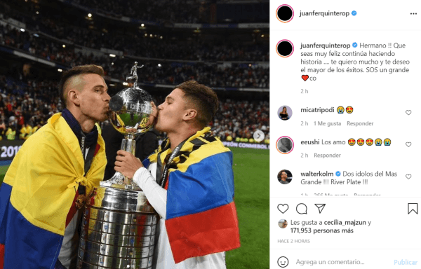 “Hermano!! Que seas muy feliz, continúa haciendo historia. Te quiero mucho y te deseo el mayor de los éxitos. Sos un grande”, exteriorizó Quintero, quien actualmente integra las filas delShenzhen FC de la máxima categoría del fútbol de China. Por supuesto, la imagen principal tiene que ver con la histórica final de Madrid.
