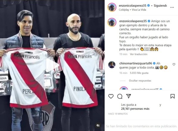 “Amigo, sos un gran ejemplo dentro y afuera de la cancha, siempre marcando el camino correcto. Fue un orgullo haber jugado al lado tuyo. Te deseo lo mejor en esta nueva etapa, Pela querido”, escribió el ex Valencia CF en su cuenta personal, donde limitó los comentarios para que los fanáticos del Millonario invadieran un mensaje muy personal y sentido para con el ahora ex defensor central. Pero más allá de las palabras, apareció el comentario de Lucas Martínez Quarta, quien sí podía escribir en la publicación.