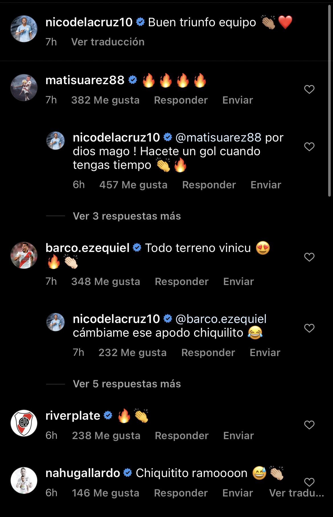 Los jugadores dirigidos por Marcelo Gallardo mostraron toda su emoción en redes sociales luego del abultado resultado contra la Lepra y varios de ellos intercambiaron divertidos mensajes vía Instagram, sacando a la luz algunos apodos como el que le puso Esequiel Barco a De La Cruz: “Vinicu”.