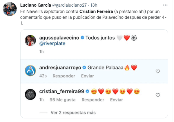 Cristian Ferreira, hoy cedido a préstamo en la Lepra, le replicó una foto a Agustín Palavecino con corazones y emojis de una cara “enamorada” luego de que su equipo haya perdido por 4 a 1 en el Monumental. Según afirma el periodista Luciano García, “en Newell’s explotaron” por el comentario del ex River, hoy defendiendo los colores del conjunto rosarino. Clima caliente.