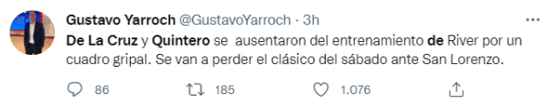 Las malas noticias se volvieron a hacer presentes en el inicio de la semana. Tal como sucedió con Paulo Díaz, Agustín Palavecino y Andrés Herrera, quienes fueron desafectados en los últimos partidos del Millonario, Juan Fernando Quintero y Nicolás De La Cruz presentaron un cuadro gripal cuando debían asistir al entrenamiento de este martes y están prácticamente descartados para jugar contra el Ciclón, a pesar de que aún existe una leve posibilidad de que lleguen.