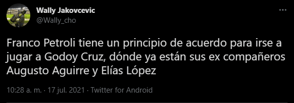 En un plantel que tiene a Franco Armani, Germán Lux, Enrique Bologna y al juvenil Leonardo Díaz, Petroli quedaba relegado como el quinto arquero, por lo tanto esta propuesta de alejarse a préstamo de River podría ser vital para su carrera.