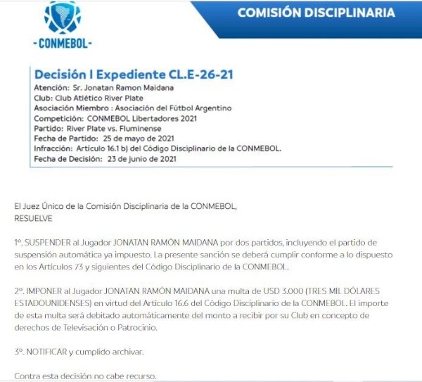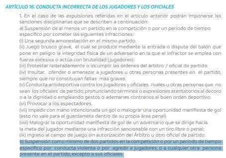 La decisión tomada por la entidad madre del fútbol sudamericano se ampara por el Artículo 16.6 del Código Disciplinario. El mismo indica que será sancionado, como mínimo, con dos fechas el futbolista que ejerza una conducta violenta o una agresión ante otro jugador /integrante del partido, a excepción de un oficial.