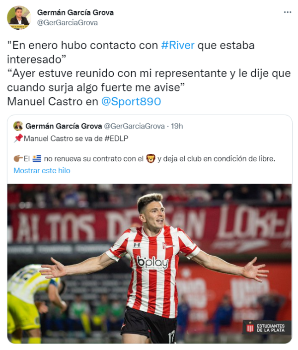 Este último caso podría darse en este mismo período de fichajes y por un jugador que River viene relojeando desdehace algunos meses. Manuel Castro, volante de Estudiantes, quedará libre el próximo 30 de junio y ya reportaron contactos con el entorno del futbolista para, al menos, conocer sus pretensiones de aquí en adelante.