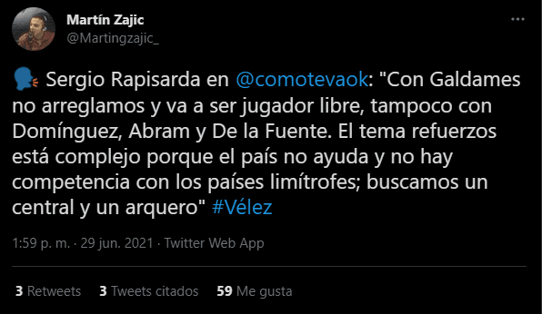 El volante se encuentra disputando la Copa América con su país, Chile, y se confirmó hoy que no continuará en Vélez y se convertirá en jugador libre. Esto fue confirmado por el propio Presidente del Fortín, Sergio Rapisarda: “Con Galdames no arreglamos y va a ser jugador libre“, afirmó en diálogo con el programa radial “¿Cómo te va?”.