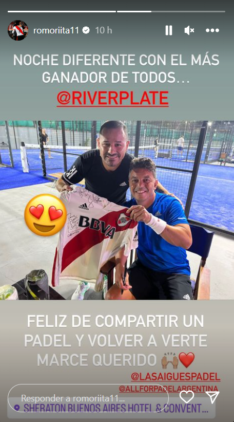 “Feliz de compartir un pádel y volver a verte, Marce querido”, cerró Mora en una historia de Instagram. Ambos posaron juntos con una camiseta autografiada. ¿Irán al Monumental dentro de dos semanas?