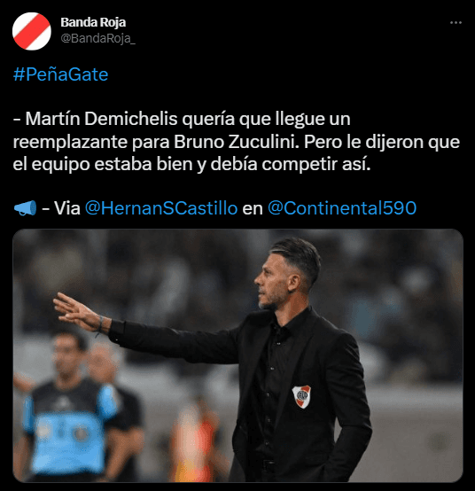 ¿Qué pasó? En concreto, el periodista Hernán Castillo confesó que Martín Demichelis quería que llegue un reemplazante para Bruno Zuculini por la dura lesión que sufrió, pero desde las oficinas de quienes administran el cluble dijeron que el equipo estaba bien y debía competir así, lo que generó un choque de posturas entre lo que pretendía elDT y lo que decidieron desde la CD.