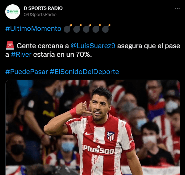 Por eso, el arribo al Millonario no solo se vuelve posible, sino que incluso estaría cada vez más cerca. De hecho, luego de la información brindada por Anello en la que daba como confirmada la llegada y que sería anunciada en el corto plazo, desde el programa “Puede pasar” de la radio D-Sports que integran los periodistas Manuel Olivari y Gustavo Kuffner dieron a conocer que “gente cercana a Luis Suárez asegura que supase a River estaría en un 70%“.