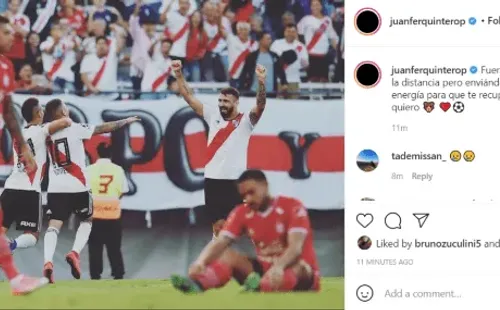 En el posteo que subió el ‘Oso’ aparecieron varios mensajes de apoyo de colegas que compartieron equipo con él en Núñez, como fue el caso de Matías Suárez, Lucas Alario y Gabriel Mercado entre otros. Pero fue Juan Fernando Quintero quien no dudó en hacer una publicación por su cuenta con una imagen de ambos gritando un gol en el Monumental.