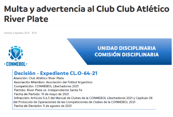 1º. IMPONER al CLUB ATLÉTICO RIVER PLATE una multa de USD 5.000 (CINCO MIL DÓLARES ESTADOUNIDENSES) por la infracción al artículo 5.6.3 del Manual de Clubes de la CONMEBOL Libertadores 2021. El monto de esta multa será debitado automáticamente del monto a recibir por el CLUB ATLÉTICO RIVER PLATE de la CONMEBOL en concepto de derechos de Televisión o Patrocinio.