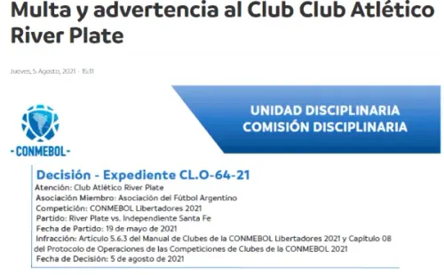 Como notifica el comunicado, River no puede apelar a esta sanción, por lo que deberá abonar la multa correspondiente a la Conmebol por no cumplir con este requisito previo de la institución con sede central en Asución.