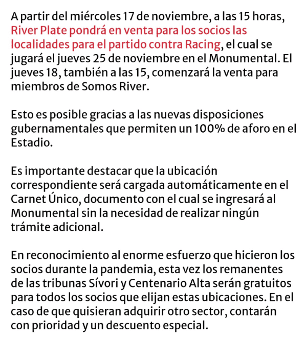 En el pie del comunicado, el Millonario agradeció a sus socios por la contribución durante el 2020 mientras corrían tiempos difíciles para el bolsillo de los argentinos. “En reconocimiento al enorme esfuerzo que hicieron los socios durante la pandemia, esta vez los remanentes de las tribunas Sívori y Centenario Alta serán gratuitos para todos los socios que elijan estas ubicaciones. En el caso de que quisieran adquirir otro sector, contarán con prioridad y un descuento especial“, cerró el comunicado.