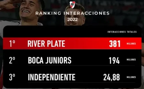 Más precisamente, River tuvo nada más ni nada menos que 381 millones de interacciones a lo largo del 2022, superando, por una diferencia realmente impactante, a Boca Juniors, su rival de toda la vida, que acumuló 194 millones de interacciones. Tercero quedó Independiente, muy por debajo, con casi 25 millones de interacciones.