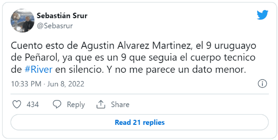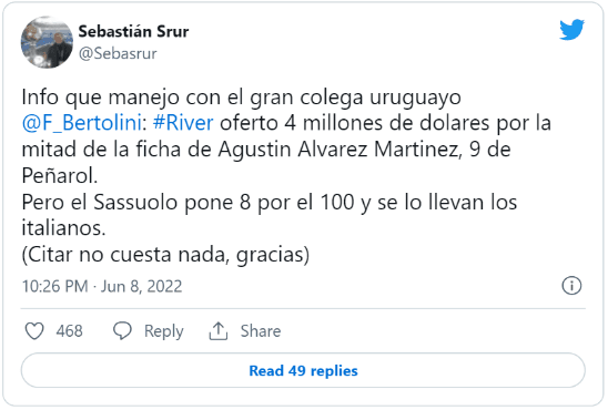 El jugador apuntado era Agustín Álvarez Martínez, de Peñarol. El periodista Sebastián Srur contó que River “negoció en silencio” y ofertó 4 millones de dólares por el 50% del pase. Sin embargo, Sassuolo desembolsó 8 por la totalidad de su ficha y el jugador se marchará a Italia.
