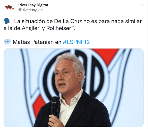 A diferencia del delantero y el lateral izquierdo, Nicolás De la Cruz está buscando extender su relación contractual con el Millonario: “La situación con De la Cruz es diferente a la de Angileri y Rollheiser, porque tenemos contacto permanente con él y su representante. Viajamos con Brito y Francescoli a hablar con sus agentes, nuestro contacto es fluido y amigable, y el jugador declaró de manera muy positiva”, aseveró Matías Patanian en diálogo con ESPN F12.