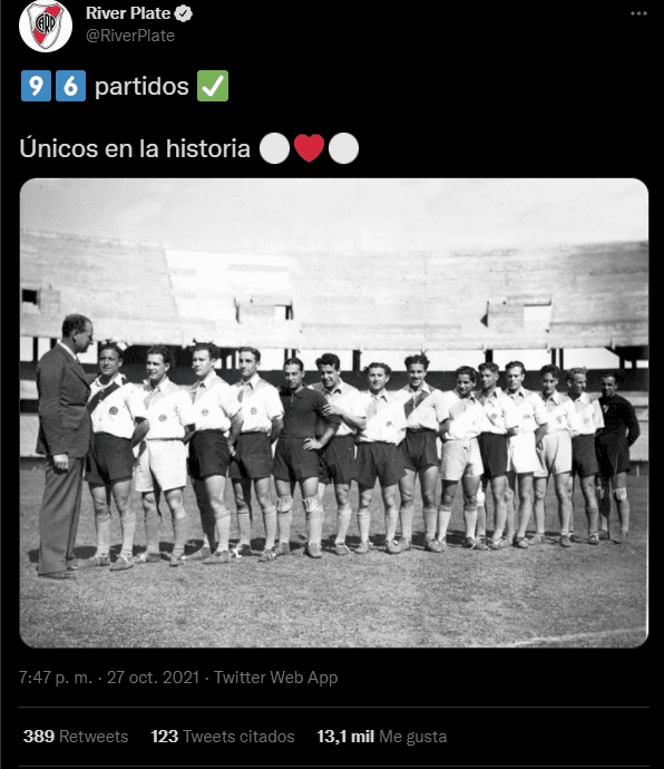 Obviamente, la cuenta oficial de River sacó chapa de esto, y le mandó un mensaje directamente al Bayern Munich. Con una foto de aquel equipo que logró la histórica hazaña de 96 partidos con mínimo un 1 en el marcador propio, el CM de la cuenta de Twitter del Millonario escribió: “96 partidos, únicos en la historia“, junto a un par de emojis. Basadísimo.