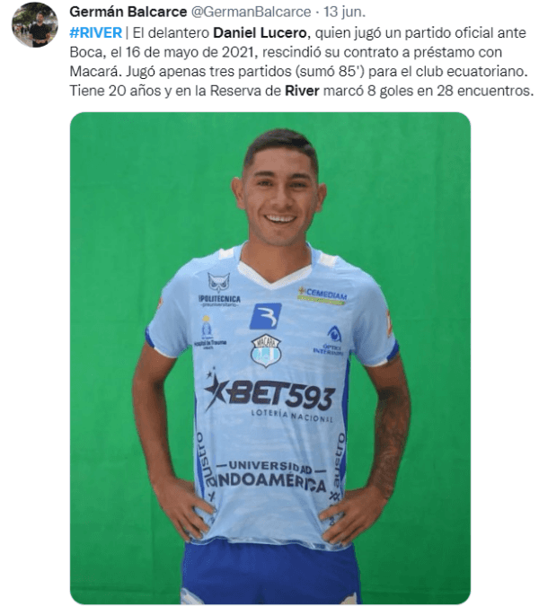 El único arribo que tendrá el Muñeco en los próximos días, a la expectativa de lo que suceda con Lucas Beltrán y su conflicto en Colón de Santa Fe, es la del juvenilDaniel Lucero. El atacante se había marchado en condición de cedido alDeportivo Macará, pero decidió ponerle fin al vínculo ante la falta de rodajey volverá a Núñez en busca de nuevas oportunidades.