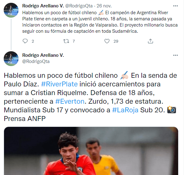 Riquelme es lateral izquierdo y apenas tiene 18 años; Arellano avisó que los contactos ya iniciaron. Ante la posible baja de Fabrizio Angileri, quien ya ha tenido el acercamiento de la Lazio en varias oportunidades, le podría dar credibilidad al presunto interés del club de Núñez en reforzar el carril. La falta de variantes quedó expuesta en el duelo de los de Gallardo contra Racing, donde el Muñeco tuvo que improvisar con Pinola ante las bajas de Casco y el ex Godoy Cruz.