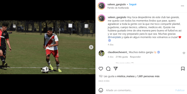 Después de la amarga noticia que les tocó recibir, fue el propio Gargiulo quien se explayó en su cuenta de Instagram, donde aprovechó el espacio para despedirse de River, además de agradecerle a todos los que le dieron una mano durante todos estos años: “Hoy toca despedirme de este club tan grande. Me quedo con todos los momentos lindos que pasé, quiero agradecer a toda la gente con la que me tocócompartir plantel, jugadores, cuerpo técnico, utileros, médicos etc. Quizás me hubiera gustado irme de otra manera, pero bueno. El fútbol es asó y sé que me voy preparado para lo que sea. Muchas gracias@riverplatey ojalá en algún momento nos volvamos a cruzar!”, sentenció el mediocampista.