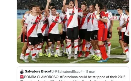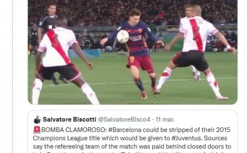¿Y en qué entraRiveren todo esto? Es que, en las últimas horas, circuló una versión -falsa, por cierto- de que podría cambiarse la final de la Champions League 2015, la última que ganaron los Culés, y que esta fuera a pasar a manos de la Juventus. A raíz de ese tuit de un fana de la Vecchia Signora, cientos de hinchas del Millonario se acordaron de la final del Mundial de Clubes que se disputó aquel año contra el equipo de Messi, Neymar, Suárez y compañía.