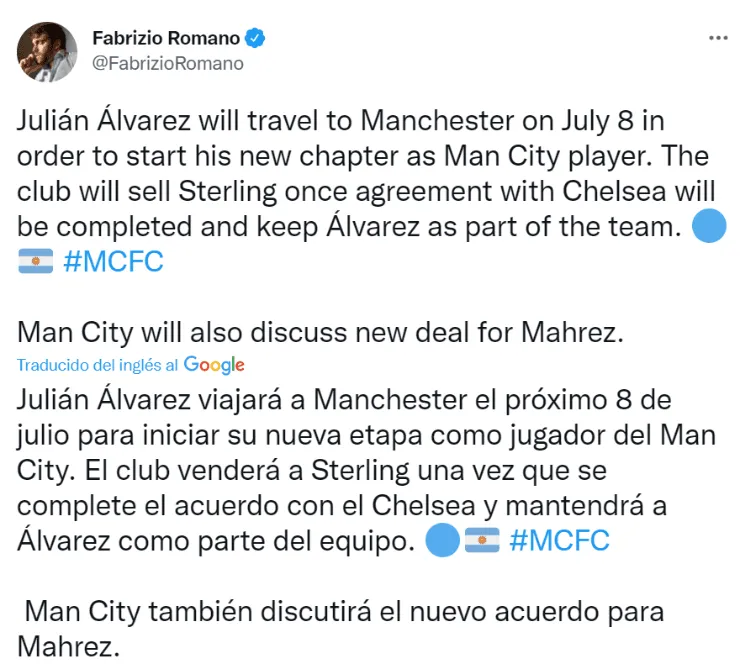 Desde Europa, el prestigioso periodista Fabrizio Romano confirmó que “Julián Álvarez viajará a Manchester el próximo 8 de julio para iniciar su nueva etapa como jugador del ManchesterCity“. Pero también aseveró que los ingleses “venderá a Sterling una vez que se complete el acuerdo con el Chelsea y mantendrá a Álvarez como parte del equipo”. Claramente, un dolor de cabeza para todo River, que soñaba con tenerlo un tiempo más.