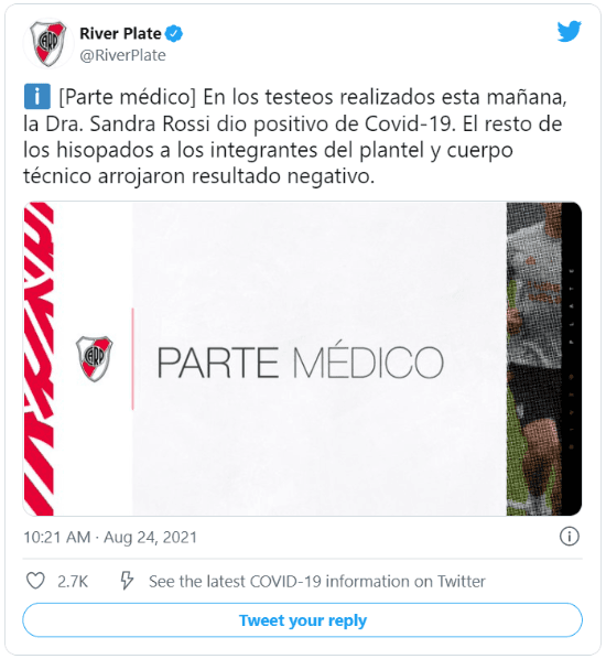 “En los testeos realizados esta mañana, la Dra. Sandra Rossi dio positivo de Covid-19. El resto de los hisopados a los integrantes del plantel y cuerpo técnico arrojaron resultado negativo”, confirmaron en la cuenta oficial de la institución de Núñez vía Twitter.