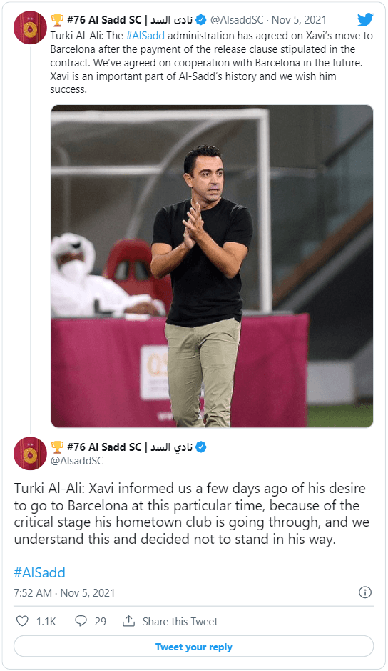 “El Al Sadd La administración ha acordado el traslado de Xavi a Barcelona tras el pago de la cláusula de rescisión estipulada en el contrato. Hemos acordado la cooperación con Barcelona en el futuro. Xavi es una parte importante de la historia de Al-Sadd y le deseamos éxito”, escribió el club qatarí. Comunicado que le alegró el día a los hinchas del Millonario.