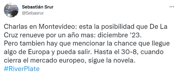 “Charlas en Montevideo: esta la posibilidad que De La Cruz renueve hasta diciembre de 2023”, publicó Srur en su cuenta de Twitter para dar a conocer la nueva propuesta que le hizo el Millonario al volante charrúa. No obstante, todavía no puede descartarse una posible venta al fútbol europeo ya que al mercado le queda más de un mes y las ofertas pueden llegar en cualquier momento. Una novela que tiene para rato.