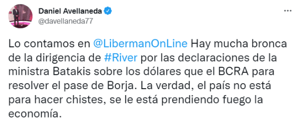 En el programaLiberman On Linerevelaron los detalles de la reacción de River al chiste que hizo la nueva ministra y no fue la mejor. “Hay mucha bronca de la dirigencia de River por las declaraciones de la ministra Batakis sobre los dólares que el Banco Central para resolver el pase de Borja”,escribió el periodista Daniel Avellaneda en su cuenta de Twitter.