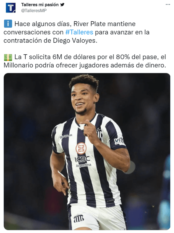 “Hace algunos días, River Plate mantiene conversaciones con Talleres para avanzar en la contratación de Diego Valoyes”, informó el portal que cuenta con más de 40 mil seguidores en Twitter para dar a conocer la noticia. A continuación se detallaron los puntos a tener en cuenta en la mediación. “La T solicita 6M de dólares por el 80% del pase, el Millonario podría ofrecer jugadores además de dinero”, trascendió.