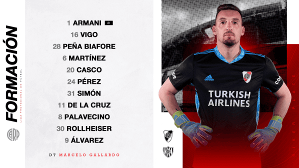Franco Armani; Alex Vigo, Felipe Peña, David Martínez, Milton Casco; Enzo Pérez; Santiago Simón, Agustín Palavecino, Nicolás De La Cruz; Julián Álvarez y Benjamín Rollheiser. DT: Marcelo Gallardo.