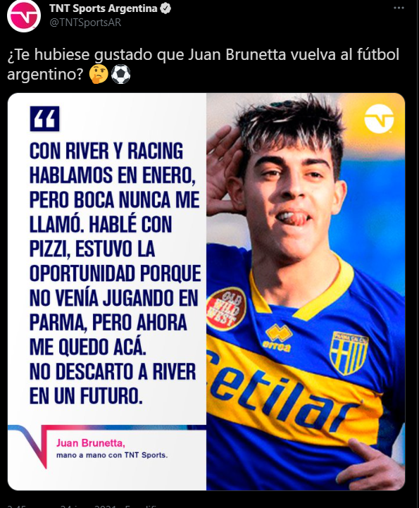 Justamente el ex Godoy Cruz, Juan Brunetta, sonó ya dos veces en River. A principios de año y recientemente, aunque en ambas ocasiones fue rápidamente descaratado por su valor monetario. Sin embargo, el actual jugador del Parma dejó claro que le gustaría jugar en el Millonario en otro momento.