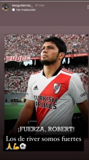 “Los de River somos fuertes”, fue el conciso mensaje del nacido en Barranquilla, donde agregó una imagen de Rojas, quien deberá comenzar con la recuperación luego de que este sábado sea intervenido quirúrgicamente. Una clara muestra de apoyo que enorgulleció a más de un hincha.