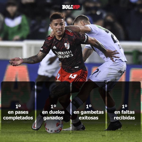 Con la baja de Enzo Pérez, Gallardo optó por Enzo Fernández como reemplazante en la mitad de la cancha. Y no falló. El ex jugador de Defensa y Justicia pesó en el desarrollo y tomó riesgos para la creación de juego en El Millonario. Por cierto, fue el jugador que más pases completó (29),duelos ganó (9),faltas recibió (4) y gambetas acumuló (3) mientras estuvo en cancha. Gran talento pensando en el futuro de River.