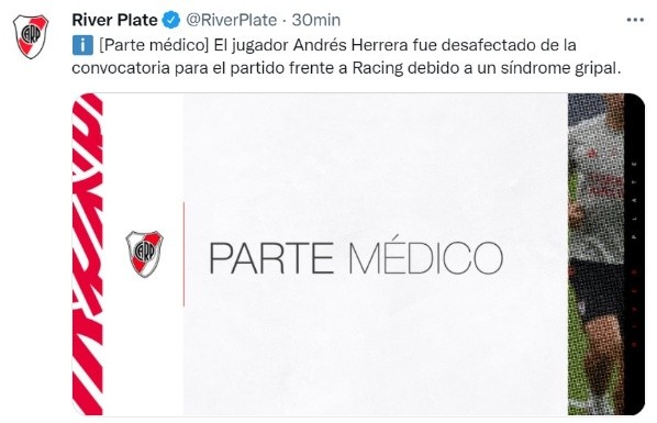 A menos de 24 horas para que River reciba a Racing, quedó descartado Andrés Herrera. El lateral derecho que llegó proveniente de San Lorenzo también se vio afectado al cuadro gripal, algo que viene sucediéndole al plantel del Muñeco.