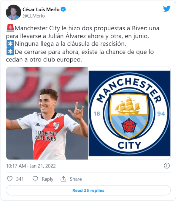 Según informó César Luis Merlo, el club inglés envió dos ofertas a River, que tienen que ver con el momento en el que se llevarán al futbolista. Una de ellas sería incorporarlo ahora y cederlo a otro club europeo, mientras que la otra sería llevárselo directamente en junio. Dato no menor: ambas propuestas son inferiores a la clásusula de rescisión del delantero.