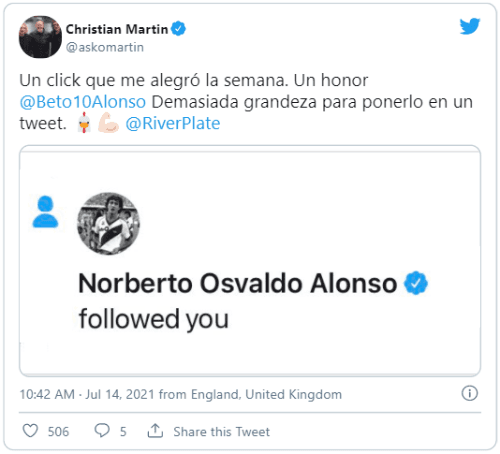 “Un click que me alegró la semana. Un honor.Demasiada grandeza para ponerlo en un tweet”, manifestó Christian pasadas algunas horas del mediodía en el Viejo Continente luego de que un ídolo de River lo siguiera en Twitter. ¿De quién se trata? ¡Del Beto Alonso!