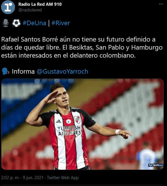Ante esto, ya fueron varios clubes que se mostraron interesados. Con una cotización inalcanzable para cualquier otro equipo argentino, el destino es el exterior. En un principio fue Sao Paolo, pero no prosperó porque Rafael Santos Borré busca revancha en el viejo continente. Previo a River, Borré pasó por Atlético Madrid y Villarreal sin pena ni gloria, por lo que ahora irá por ello.