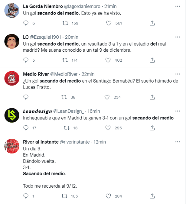 La reacción en Twitter ante semejante remontada fue multitudinaria, pero los hinchas de River se hicieron sentir con memes y burlas hacia Boca tras el tercer gol del Merengue. Una de las grandes cargadas desde el lado del Millonario, en el recuerdo de la final de la Copa Libertadores 2018, es el gol de Lucas Pratto ni bien se realizó el saque desde la mitad de la cancha tras el gol de Wanchope Ábila. Tras una jugada similar en el partido de Champions, los fieles de La Banda no pudieron contener la risa en redes sociales. Como si fuera poco, el resultado final también fue motivo de gastadas.