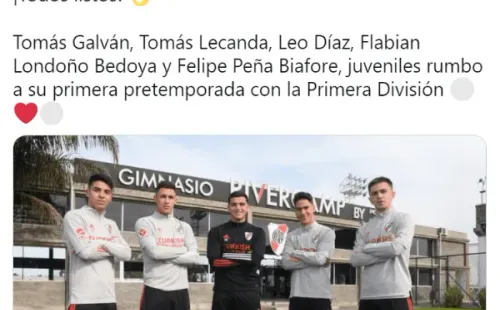 “¡Todos listos! Tomás Galván, Tomás Lecanda, Leo Díaz, Flabian Londoño Bedoya y Felipe Peña Biafore, juveniles rumbo a su primera pretemporada con la Primera División”, fue el texto que publicaron las cuentas oficiales del club con una foto de todos posando.