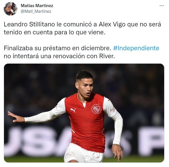 Matías Martínez, periodista de Radio La Red, informó durante este martes queLeandro Stillitano, actual entrenador de Independiente tras al salida de Julio César Falcioni, le comunicó a ciertos futbolistas del plantel del Rojo que no los tendrá en cuenta para 2023 y entre ellos está Alex Vigo, el lateral por el que tanto insistió Marcelo Gallardo para que llegara desde Colón. Volverá al Millo.